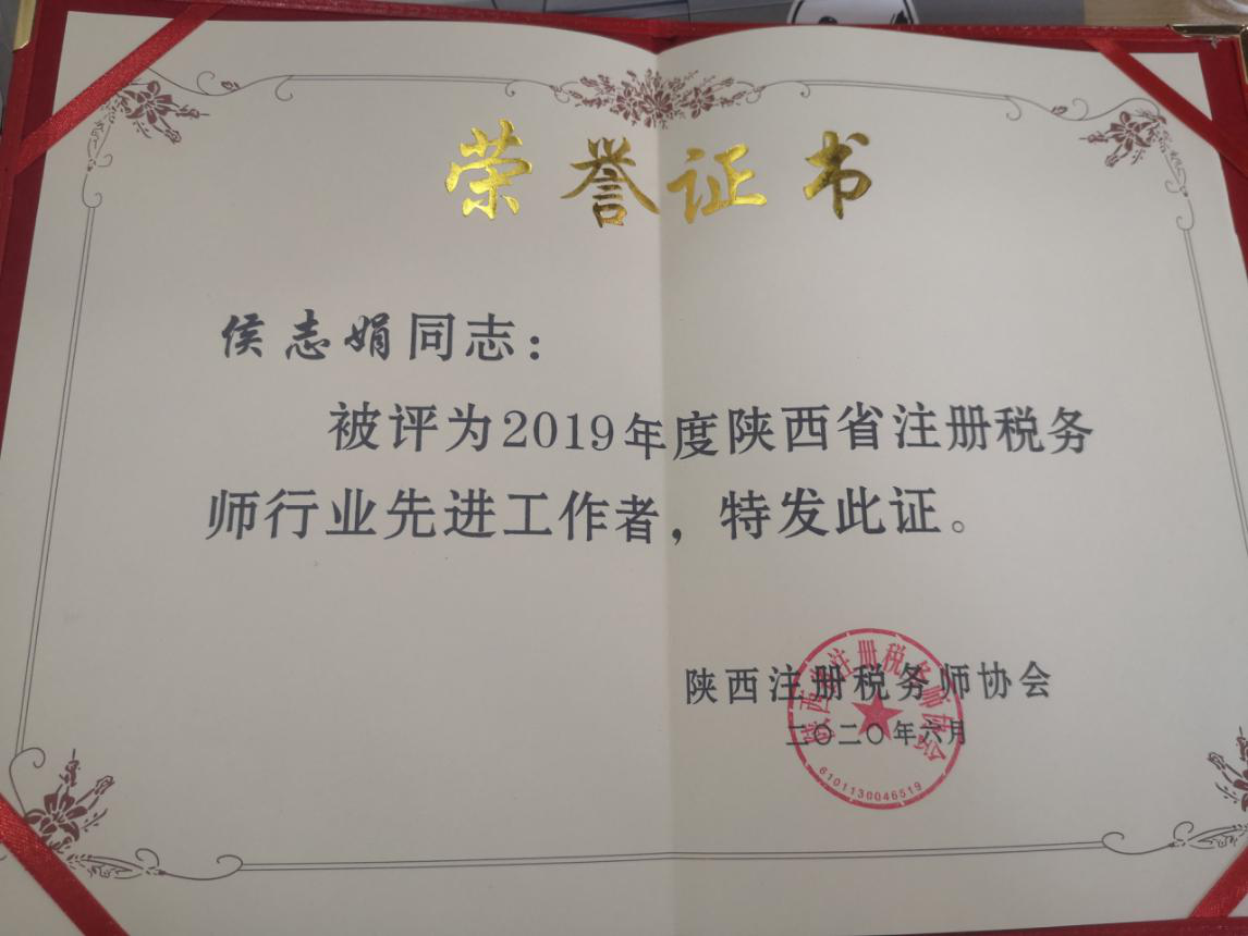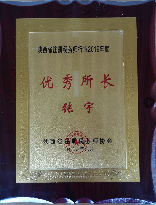 张宇所长被评选为:陕西省注册税务师行业2019年度“优秀所长”