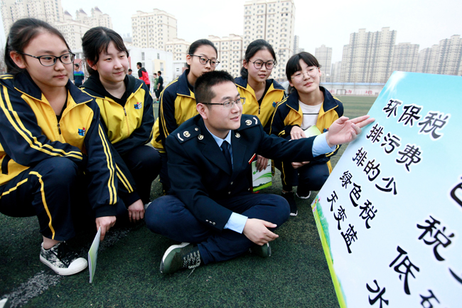 河北省衡水市桃城区地税局税务人员到该市第十四中学向学生宣传环保税。