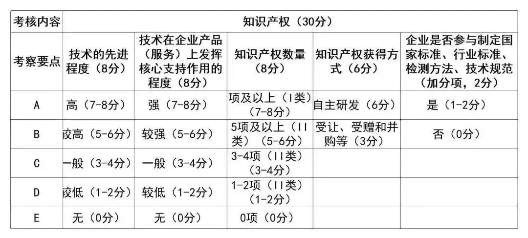 企业创新能力主要从知识产权、科技成果转化能力、研究开发组织管理水平、企业成长性等四项指标进行评价。各级指标均按整数打分,满分为100分,综合得分达到70分以上(不含70分)为符合认定要求。四项指标分值结构如下: