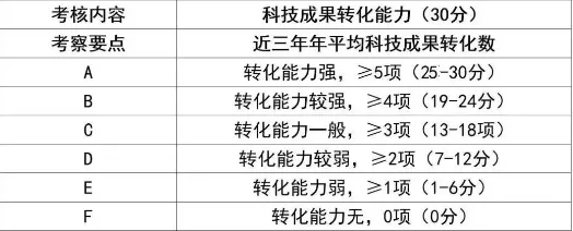 ②科技成果转化的计算是按照一个成果对应一个转化,要想获得高分必须产生15个不同的科技成果,尽量多申请相关知识产权等;每个成果确认转化为不同的产品、服务、工艺、样品、样机、检测、查新、试用等证明。